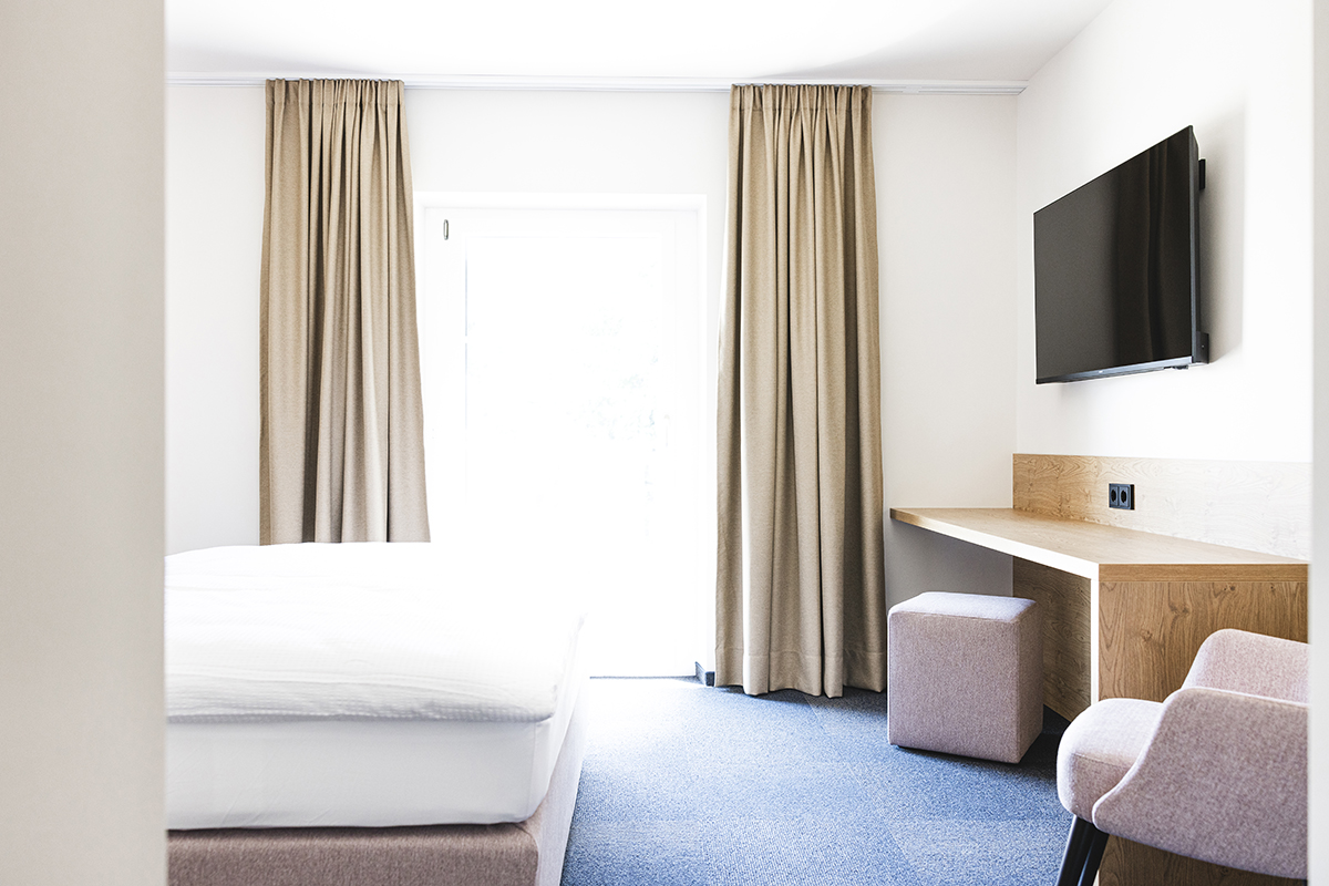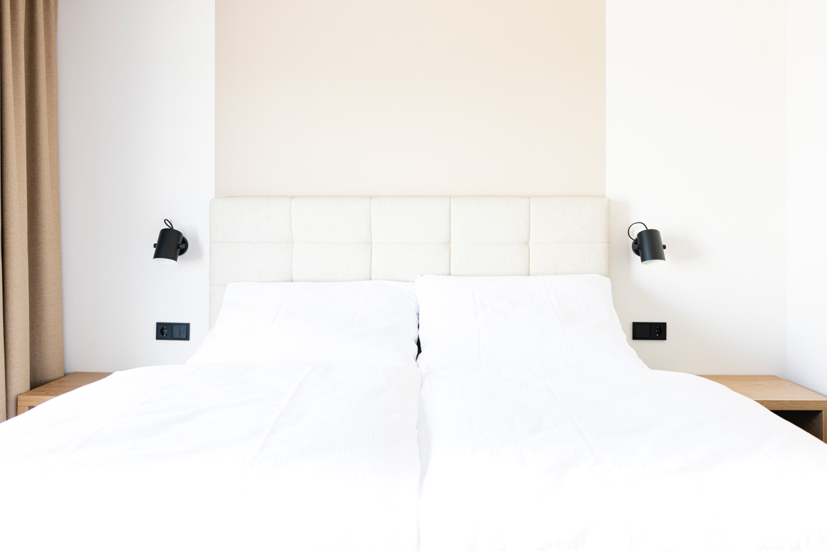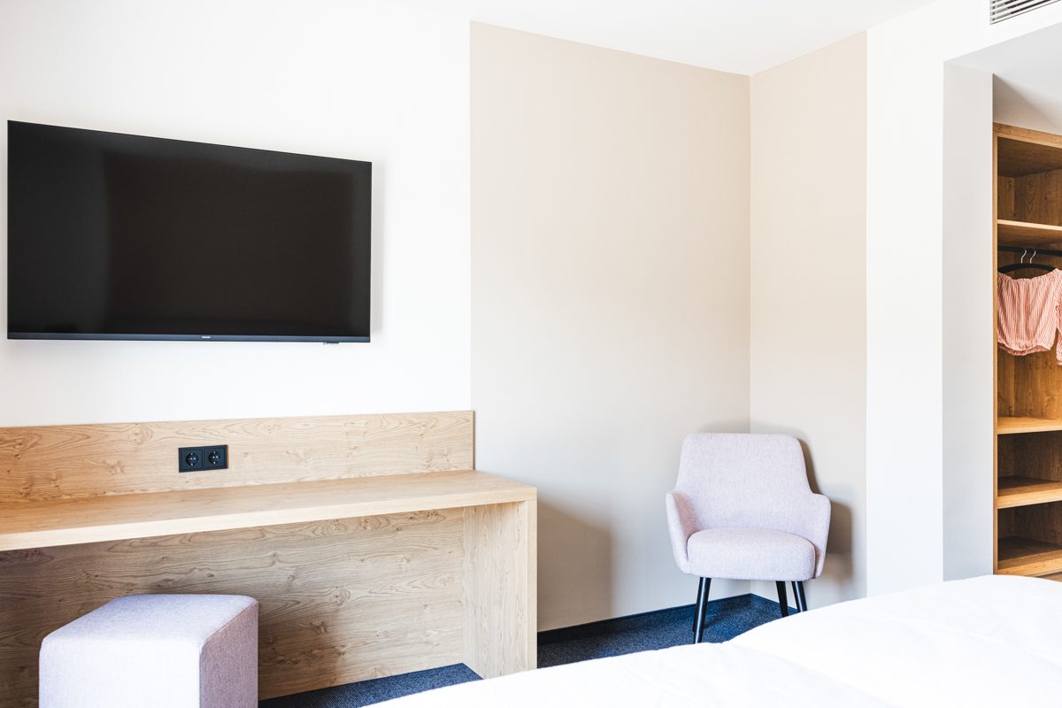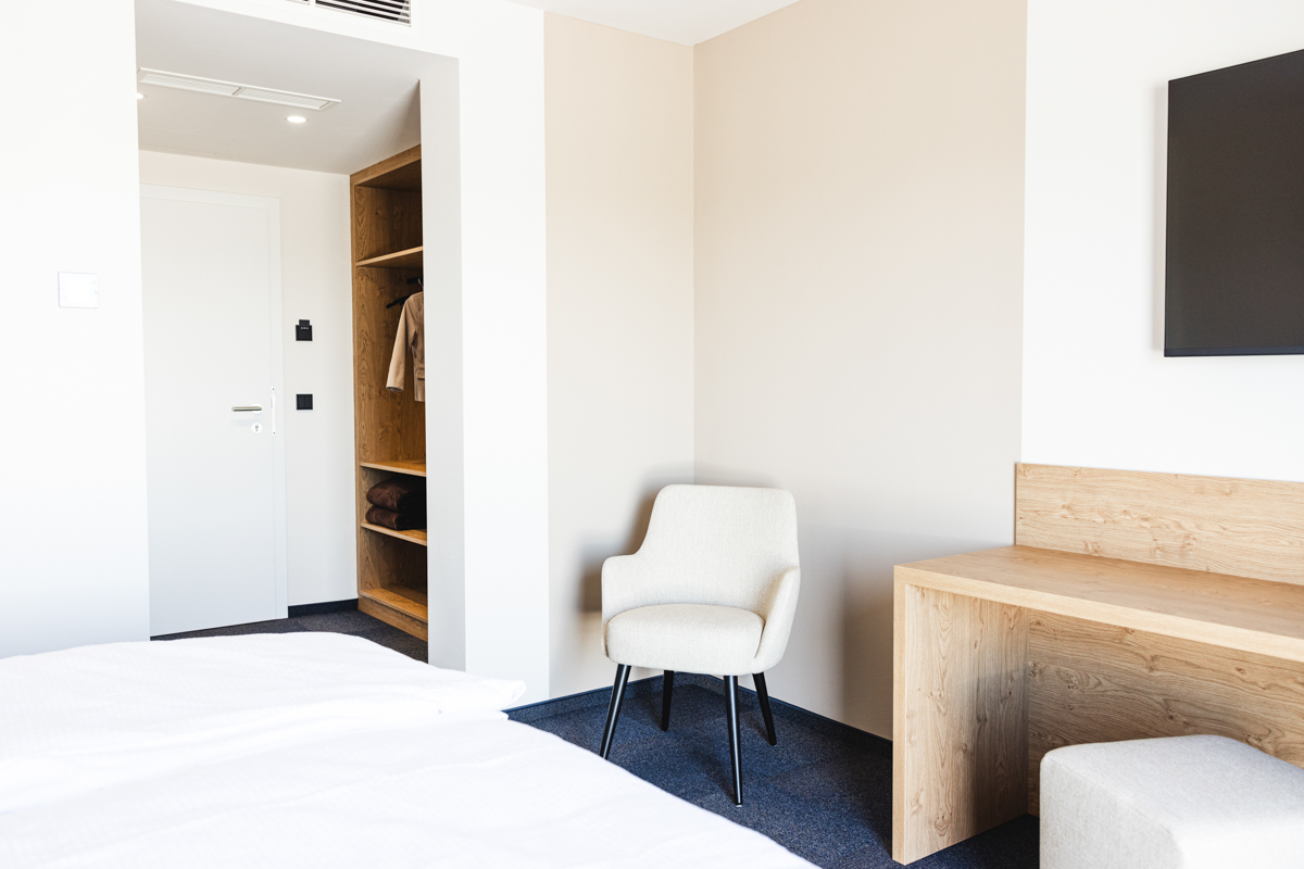 Unser modernes Doppelzimmer mit großzügiger Terrasse ist ideal für alle, die entspannt das Südoststeirische Vulkanland entdecken möchten. Helle Räume, hochwertige Ausstattung und liebevolle Details schaffen eine komfortable Auszeit.