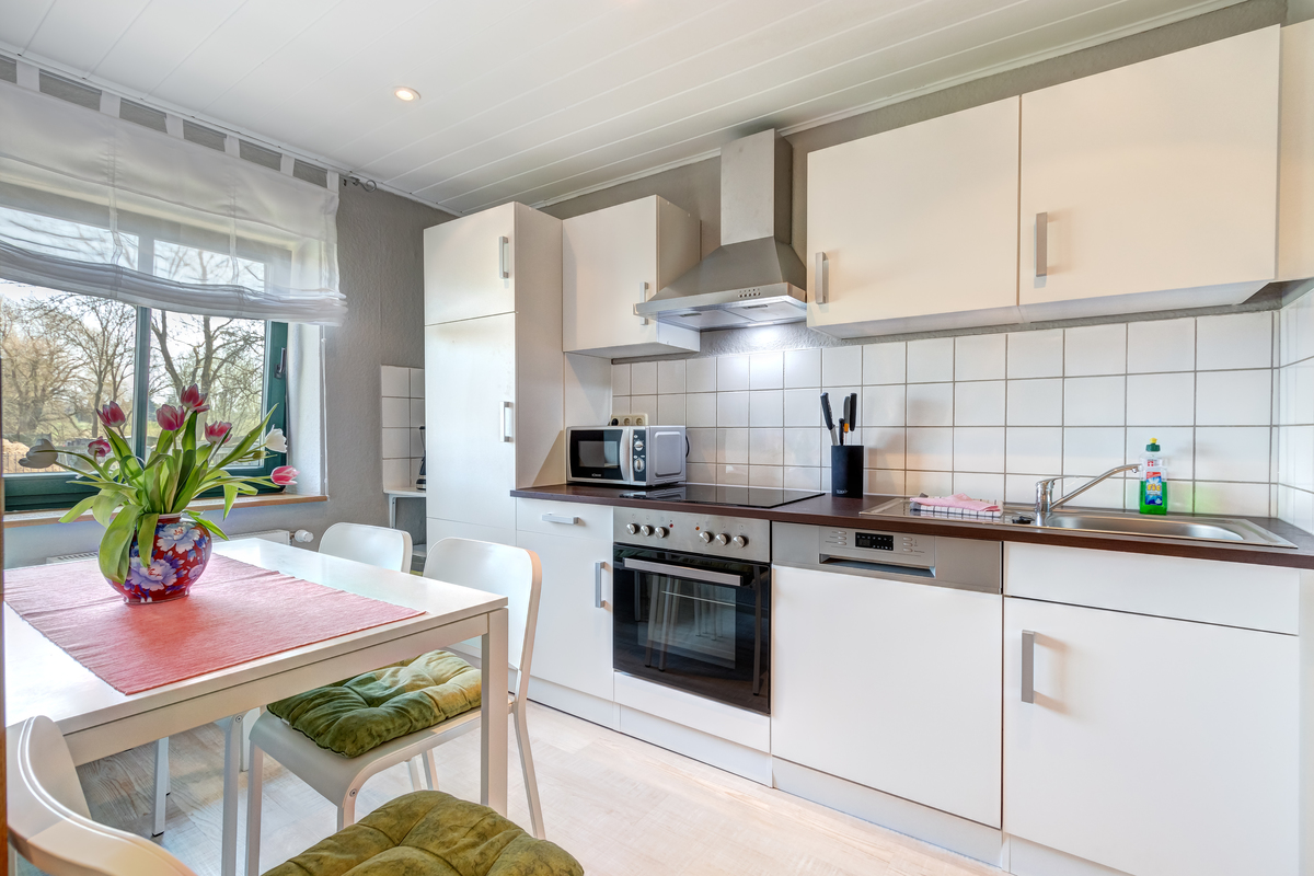 mit Gefrierfach, Mikrowelle, Küche , Essbereich für 4 Personen,, Wasserkocher, Küchenutensilien, Backofen