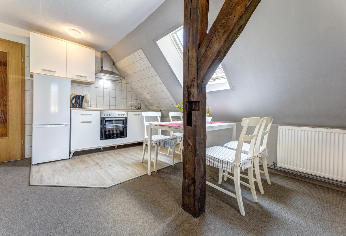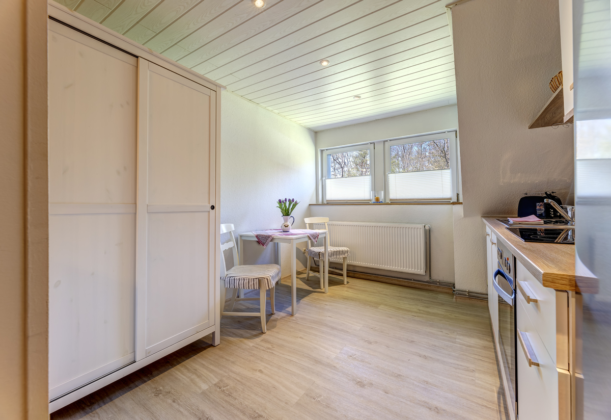 Miniküche integriert im Wohnraum mit 2-Kochplatten, Toaster, Kaffeemaschine, Esstisch für 4 Personen, Handtücher, Bettwäsche, Obere