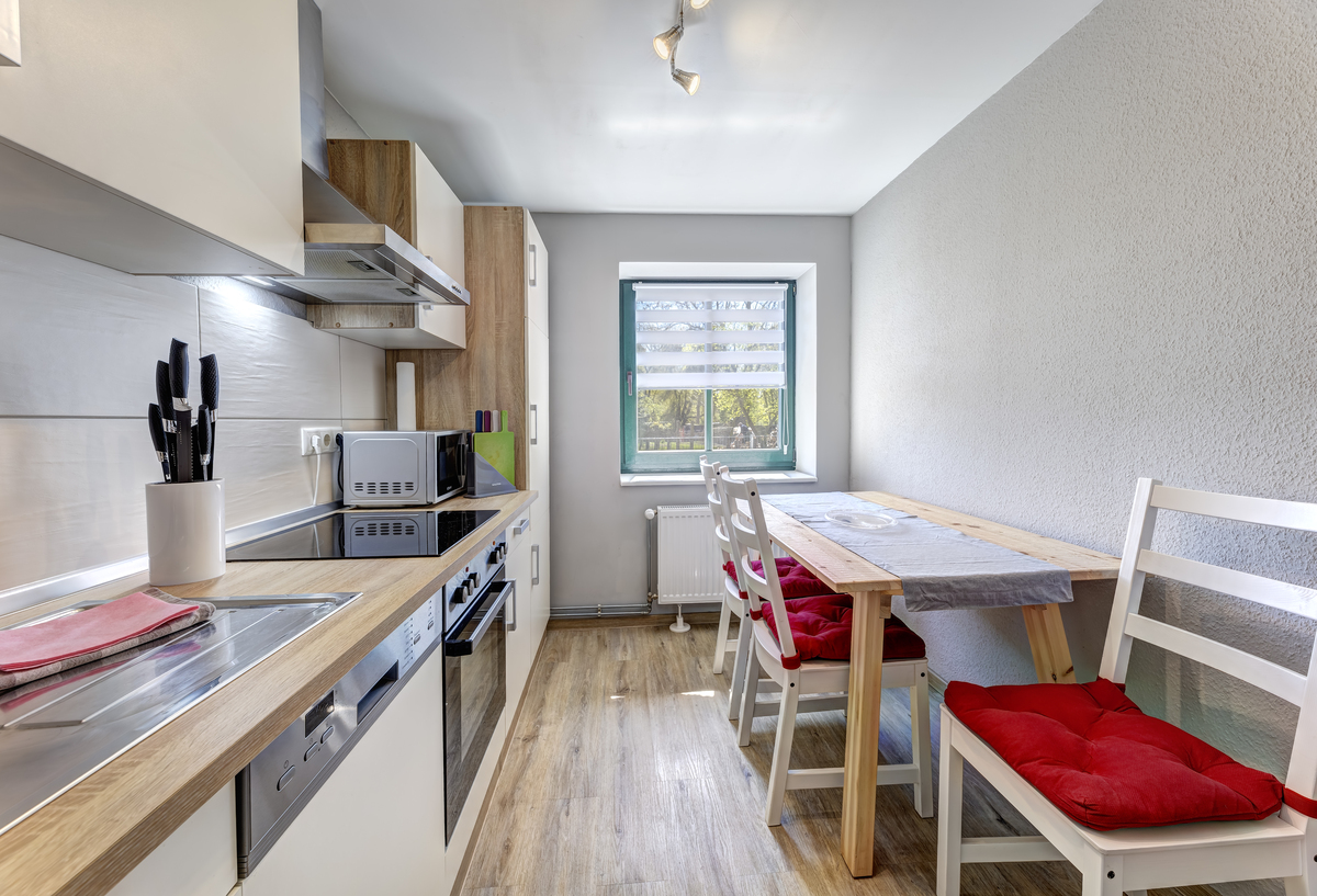 Kühlschrank, Mikrowelle, Essbereich, Wasserkocher, Küchenutensilien,