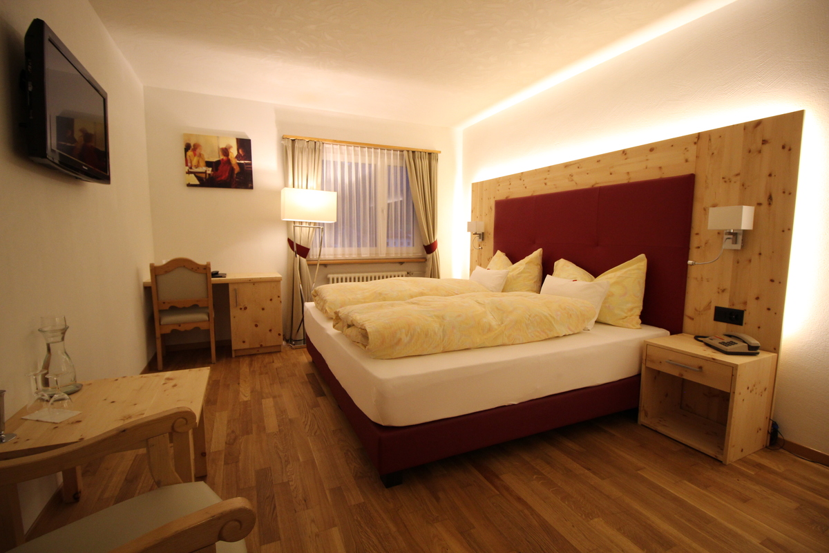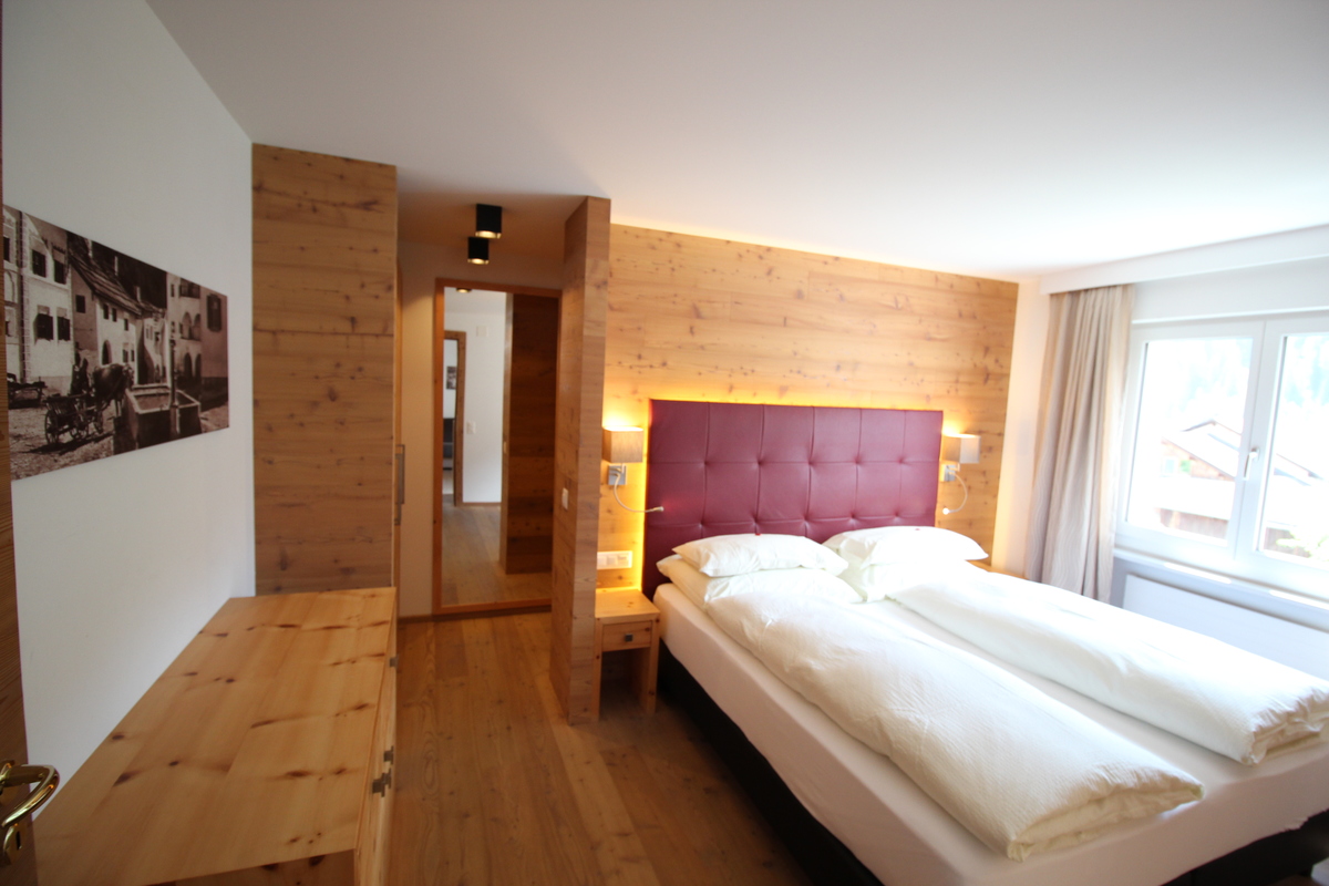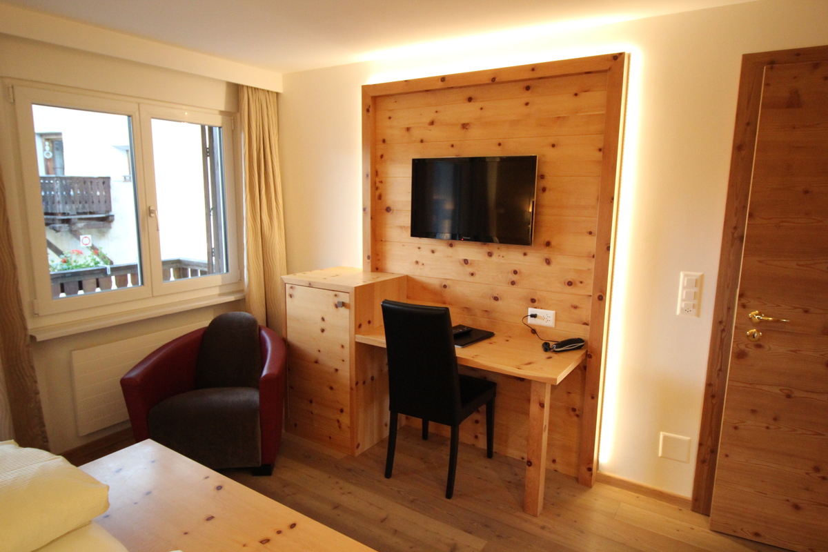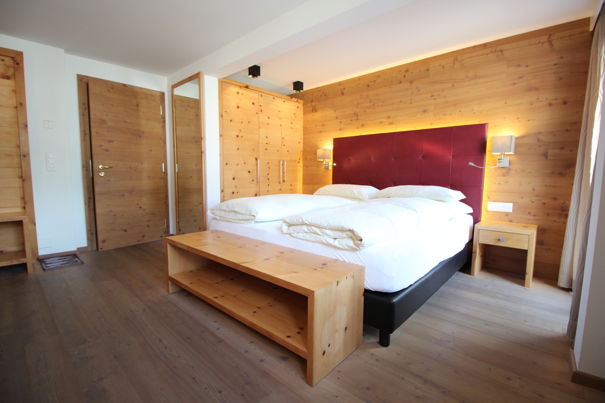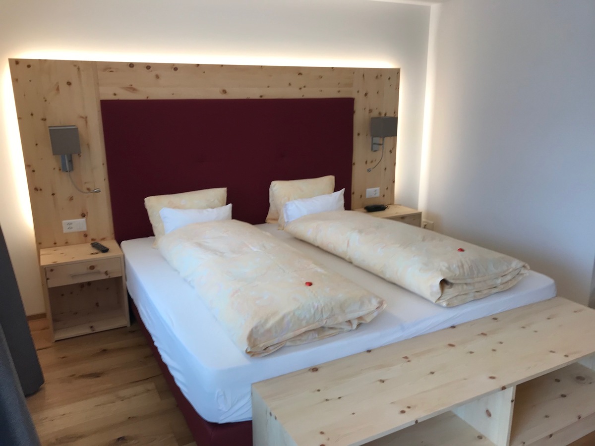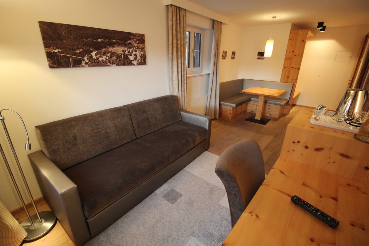 Beautiful, spacious double rooms (30m² studio) with two beds, pinewood furniture, shower/WC, hairdryer, shower gel, shampoo, satellite TV, minibar, safe, radio, telephone, seating area with sofa, free Wi-Fi, kitchenette, and balcony.